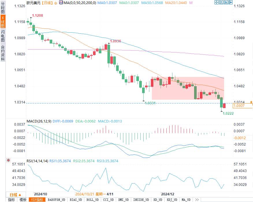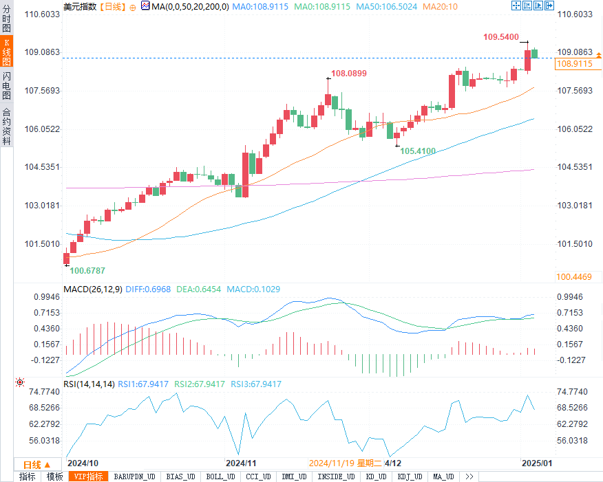 美元指数(DXY)一度触及109.54的两年高点,但最终小幅回落至108.91,较周初上涨了约0.85%。尽管美元在本周略有回调,但整体依然呈现出较为强势的走势。美国经济的表现继续优于其他主要经济体,稳健的劳动力市场和顽固的高通胀推动美国公债收益率上升,从而刺激了对美元的需求。此外,市场普遍预期2025年美联储将继续维持相对较高的利率水平,并且美国政府的减税和关税政策也为美元提供了支撑。