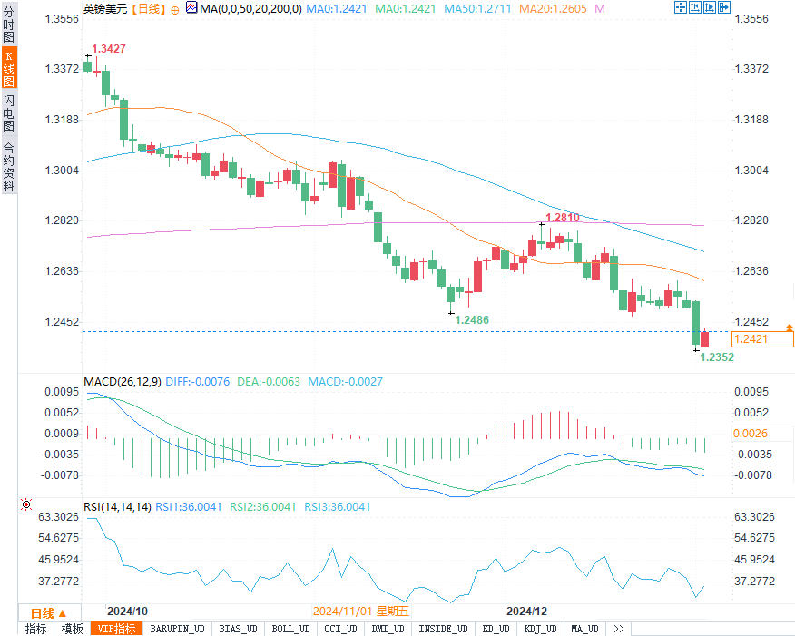 欧元兑美元触及26个月来的低点,跌幅接近1.2%。欧元区经济前景依然不明朗,尤其是受欧洲央行可能比美联储更大幅降息的预期影响,欧元的跌势持续。法国的预算战和德国大选等不确定因素也加剧了市场对欧元的担忧。