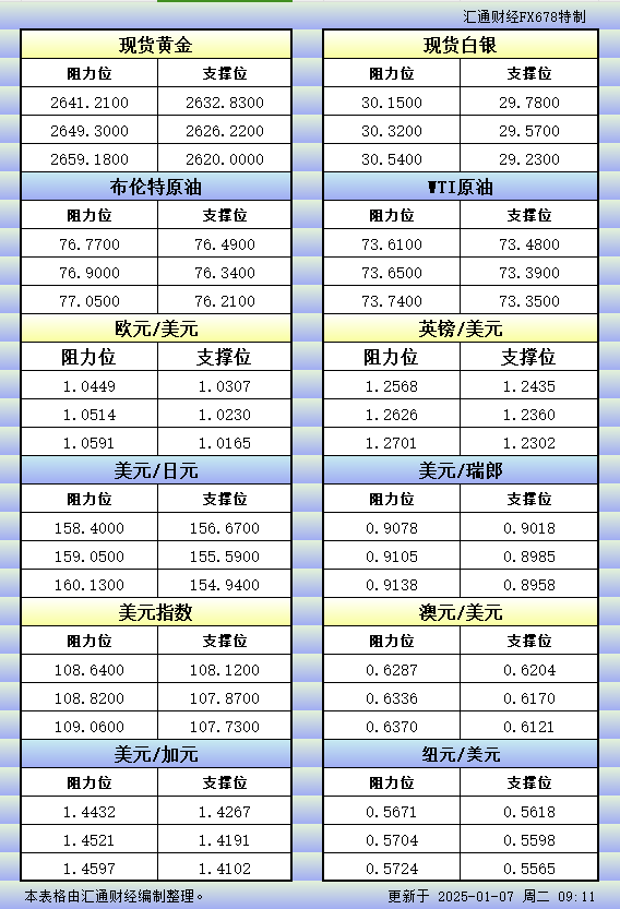 1月7日亚市更新的支撑阻力:金银原油+美元指数等八大货币对
