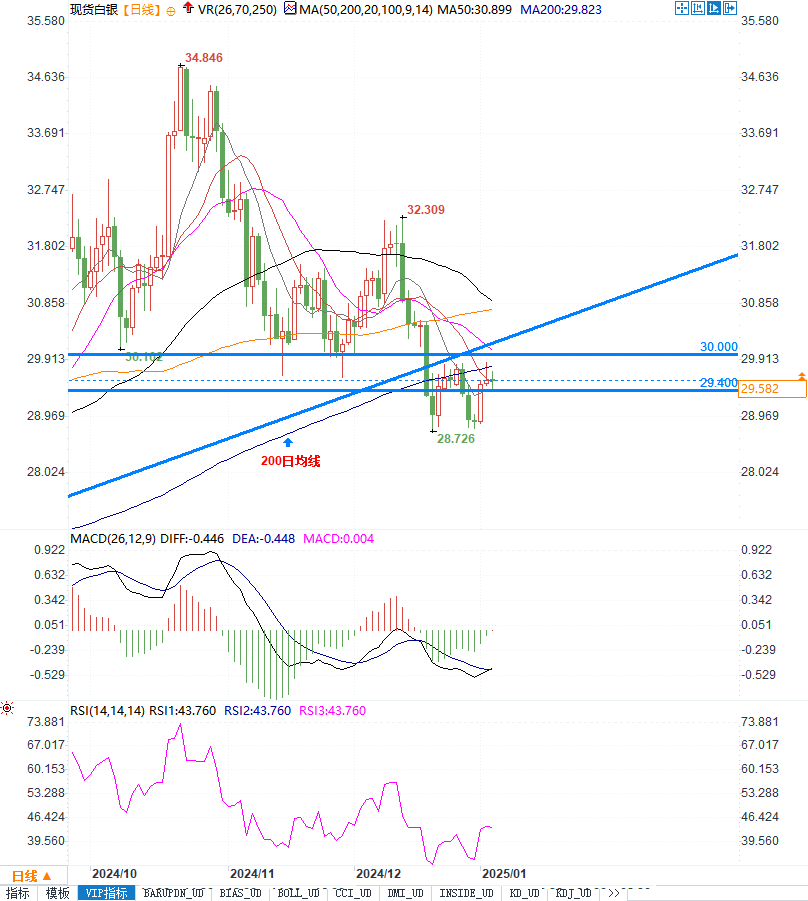 从当前基本面和技术面的分析来看,白银短期内面临的压力较大。美元的强势以及通胀预期的缓解都对白银价格构成压力。从技术角度来看,200日均线的压制以及日线图振荡指标的负值状态进一步确认了空头趋势。