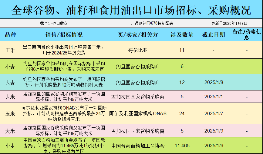 全球谷物、油籽和食用油出口市场招标、采购概况: