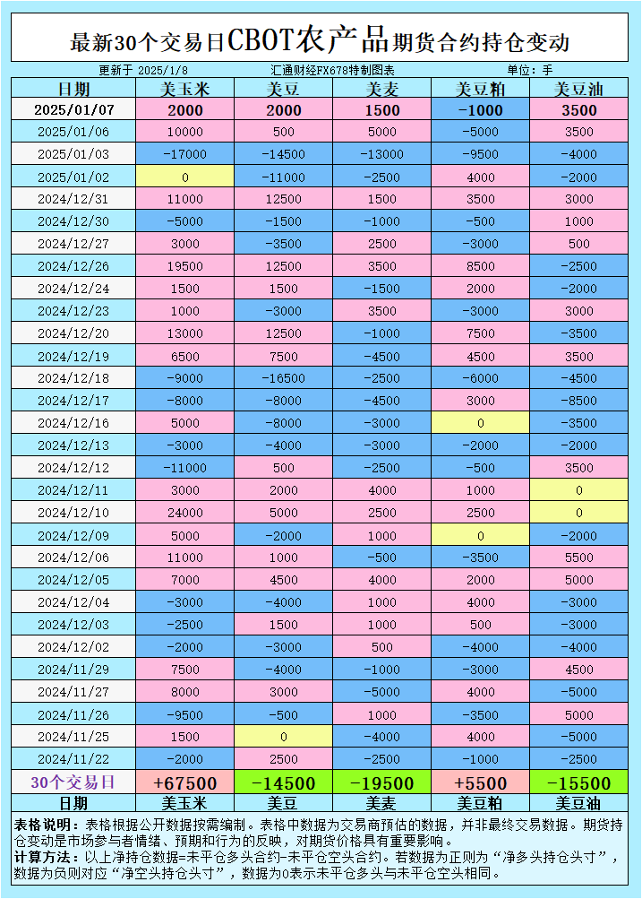 增加CBOT玉米投机性净多头;增加CBOT大豆投机性净空头;增加CBOT小麦投机性净空头;增加CBOT豆粕投机性净多头;增加CBOT豆油投机性净空头。