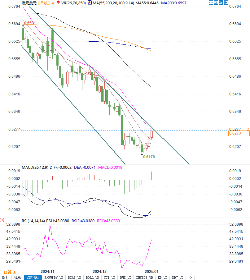 从中长期趋势来看,澳元仍处于较为显著的看跌结构中,尽管短期内出现反弹迹象,但整体趋势尚未扭转。市场密切关注澳大利亚和美国即将发布的重要经济数据,特别是澳大利亚CPI和美联储会议纪要,这些可能为未来趋势提供更清晰的指引。