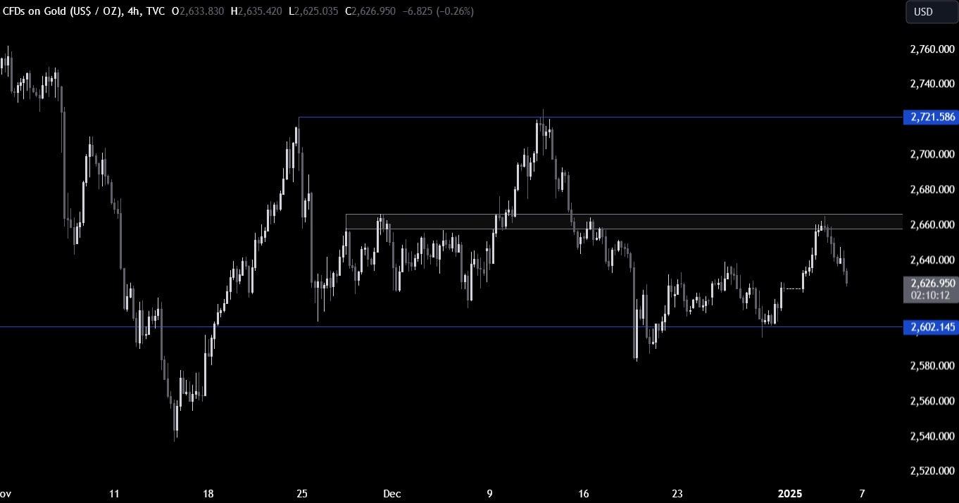 在4小时图上,我们可以看到价格最近反弹至2660水平附近的区间中间,但随着卖家纷纷入仓以跌破支撑位,价格迅速回落。买家需要突破 2660 区域,才能为接下来反弹至 2721 阻力位打开大门。