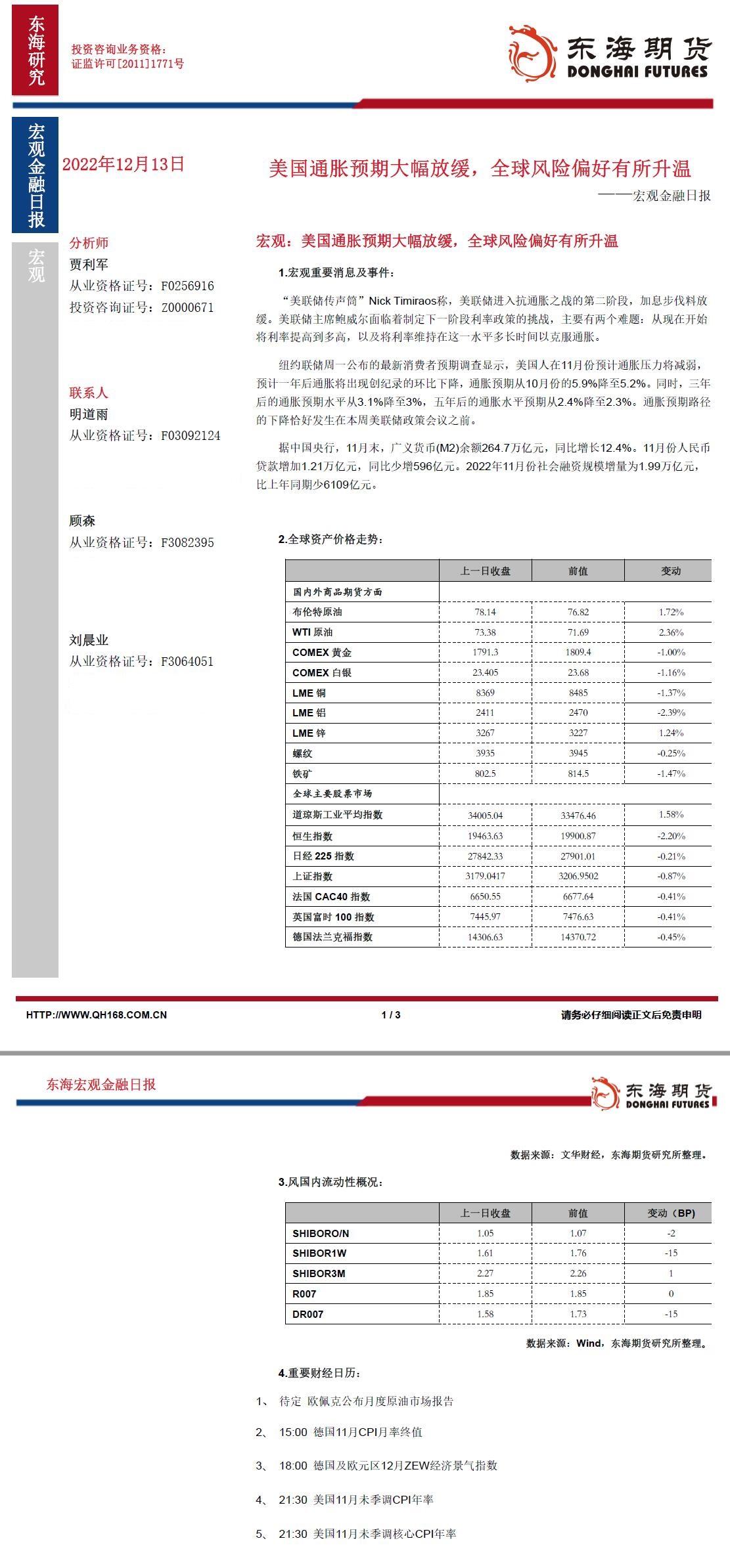 标题:【东海期货12月13日宏观金融日报】:美国通胀预期大幅放缓,全球风险偏好有所升温