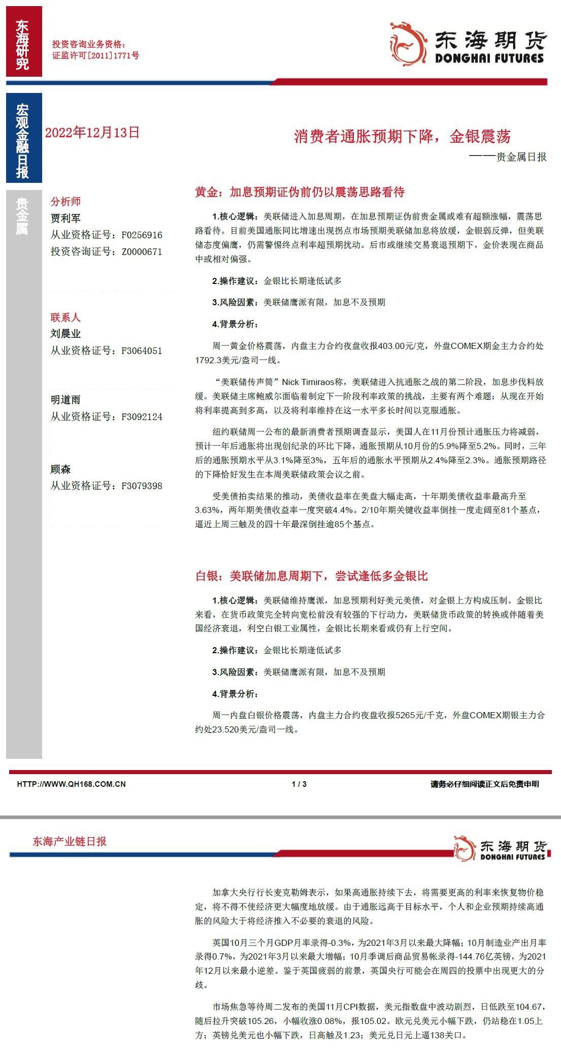 标题:【东海期货12月13日产业链日报】贵金属篇:消费者通胀预期下降,金银震荡