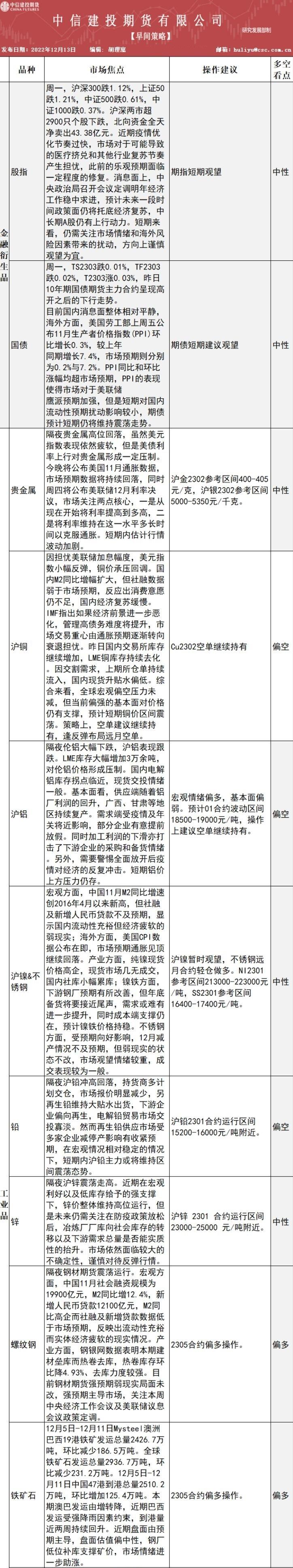 标题:中信建投期货12月13日早间交易策略