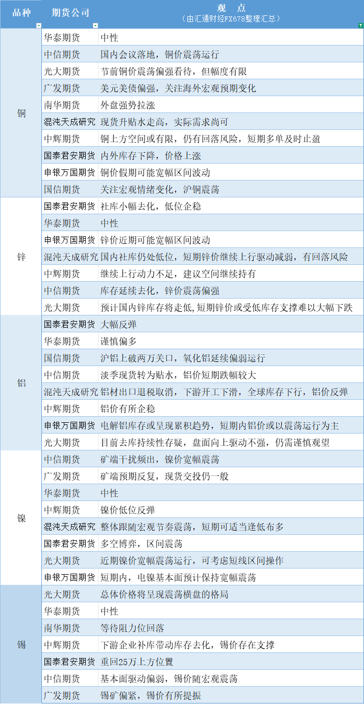 汇通财经APP讯——期货公司观点汇总一张图:1月10日有色系(铜、锌、铝、镍、锡等)。更多详见本文的汇通财经特制图。