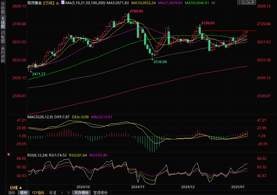现货黄金守在近四周高位,目前交投于2690美元/盎司。金价上周五延续涨势,最高触及2697.87美元/盎司,为12月12日以来新高,收报2689.13美元/盎司,原因是特朗普新政府政策的不确定性提升了避险吸引力,即使强于预期的美国就业数据强化了美联储今年可能不会大刀阔斧降息的预期。