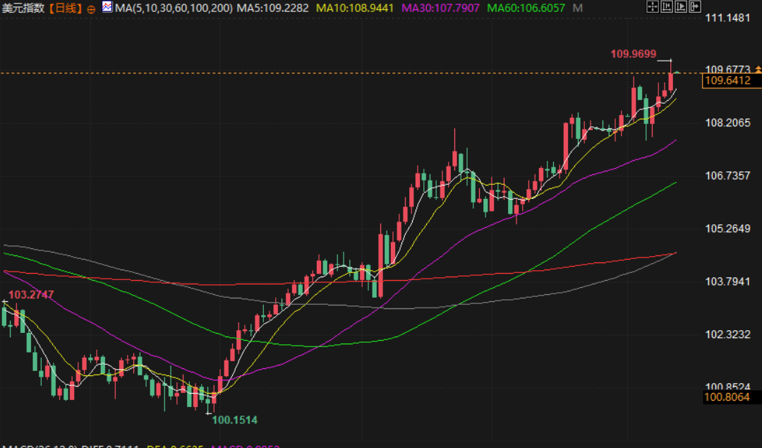 美元指数盘尾上涨 0.4%,报 109.68。