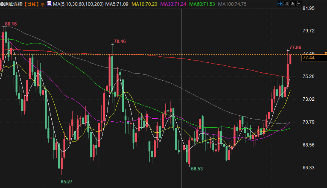 布伦特原油期货 报收于每桶79.76美元,上涨了2.84美元,涨幅为3.7%,盘中自10月7日以来首次突破每桶80美元。美国原油期货上涨2.65美元,涨幅3.6%,报收于每桶76.57美元,也创下了三个月以来的新高。这两大合约盘中均上涨逾4%,此前一份未经核实的制裁细节文件在欧洲和亚洲的交易商中传阅。