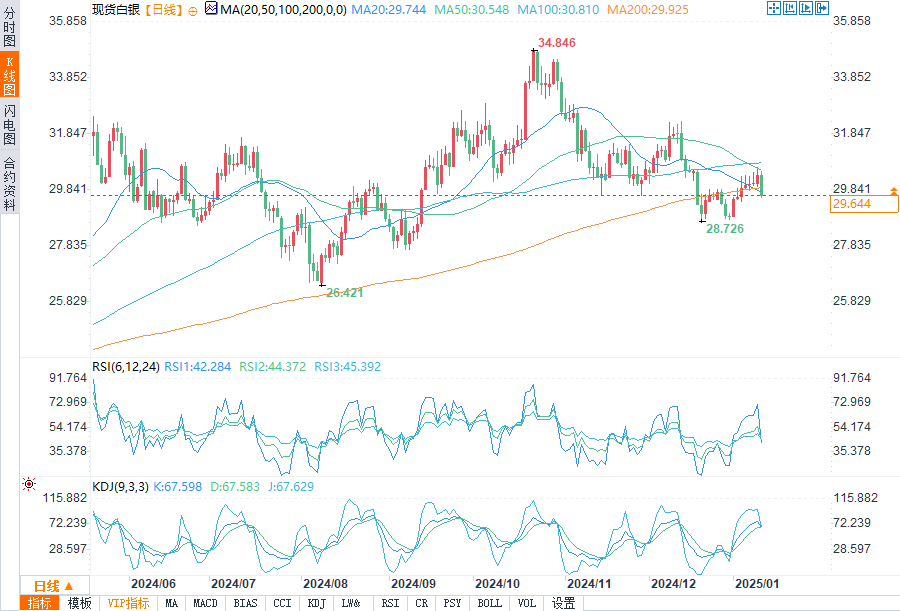 现货白银报29.643美元/盎司,跌幅2.44%。