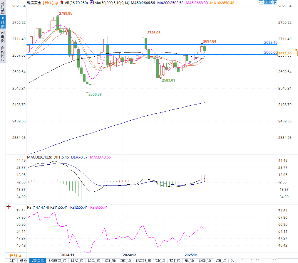 3.未来可能的技术走势若黄金价格能够守住2660美元的支撑区域,并在此形成底部形态,则有望再次挑战2693.40美元的阻力位。一旦突破该阻力,金价可能进一步上行,重新测试2700美元的心理关口。