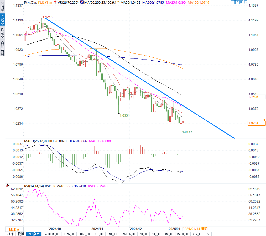 目前市场的关键在于价格是否能够有效突破1.0250支撑位。如果这一支撑被打破,欧元/美元的价格可能进一步下探,市场将进入更深的下行通道。而如果价格能够维持在支撑位之上,则可能在短期内出现反弹或横盘整理。