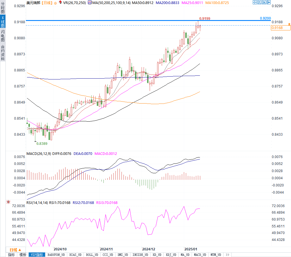 从基本面与技术面来看,美元/瑞郎当前呈现出较为明确的上涨趋势。基本面方面,美联储的利率政策和瑞士央行的降息措施为美元提供了支撑,而瑞士经济的脆弱性进一步压低了瑞郎的表现。技术面则显示,若能有效突破0.92的关键阻力位,将可能引发更大规模的上涨行情,目标价位看向1.00的平价水平。