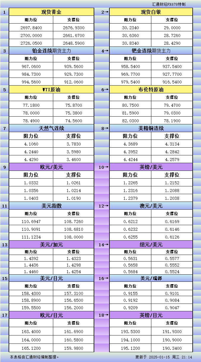 标题:1月15日美市更新支撑阻力:18品种支撑阻力(金银铂钯原油天然气铜及十大货币对)