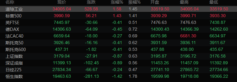 标普500指数上涨1.43%,报3990.56点;纳斯达克指数攀升1.26%,报11143.74点。