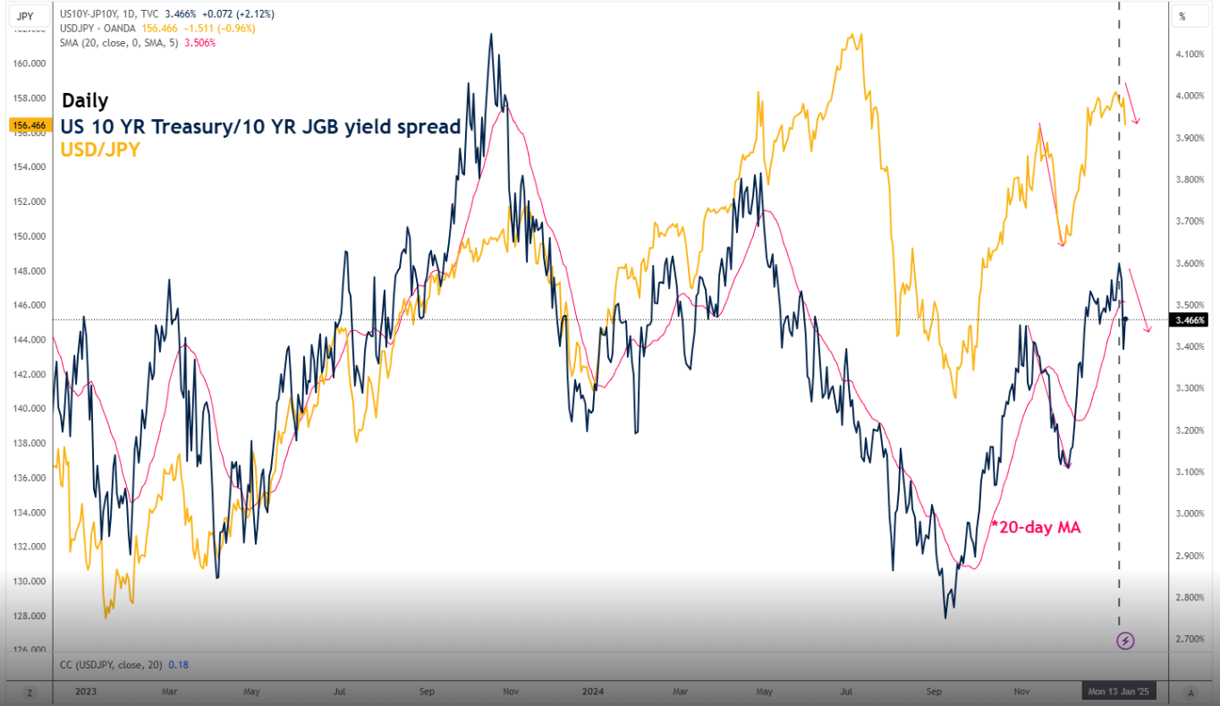 (图2:截至2025年1月16日美国国债/日本国债10年期收益率利差与美元/日元走势)