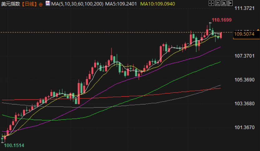美元指数上涨 0.34% 报 109.33 ,远离本周初触及的逾两年高位。