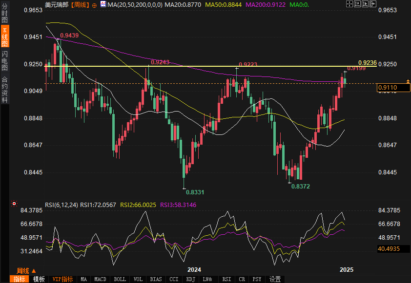 美元兑瑞郎的涨幅,尤其是在市场对瑞士央行政策预期加强的情况下。其次,美元受到特朗普即将上任的政治预期和美联储货币政策的影响,仍可能维持相对坚挺。