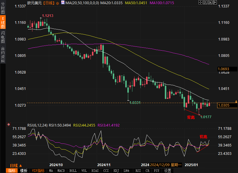 欧元兑美元的走势可能会继续受市场情绪和即将出台的美国政策影响。在特朗普即将就职的背景下,投资者将密切关注其政策方向,尤其是可能带来的关税措施和国内经济刺激政策。如果特朗普的政策能够激发美国经济增长并加大通胀压力,美元可能会迎来进一步的上涨。而在欧洲方面,市场预计欧洲央行将在今年采取更多的降息行动,这将持续施压欧元。