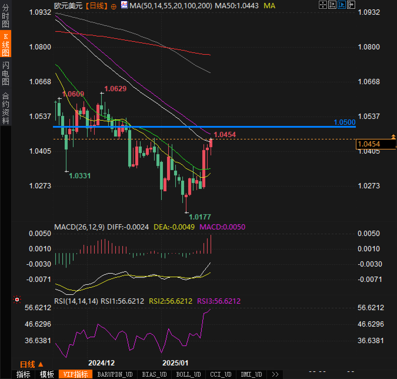 支撑与阻力位解读从技术支撑角度来看,1月13日低点1.0175是当前的关键支撑区域。如果跌破这一水平,欧元可能进一步承压,甚至测试更低的支撑水平。相反,从阻力位来看,心理关口1.0500是多头需要突破的关键障碍。如果能够突破1.0500,则可能吸引更多买盘力量,为欧元的进一步上涨提供动力。