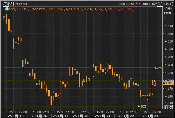 从技术角度来看,棕榈油期货的短期走势依然承压。虽然棕榈油的价格已经从最近的低点反弹,但挑战4200马币的心理关口仍显乏力。当前市场情绪略显谨慎,投资者继续关注全球植物油市场的动态,尤其是中国和印度尼西亚的相关政策变化。