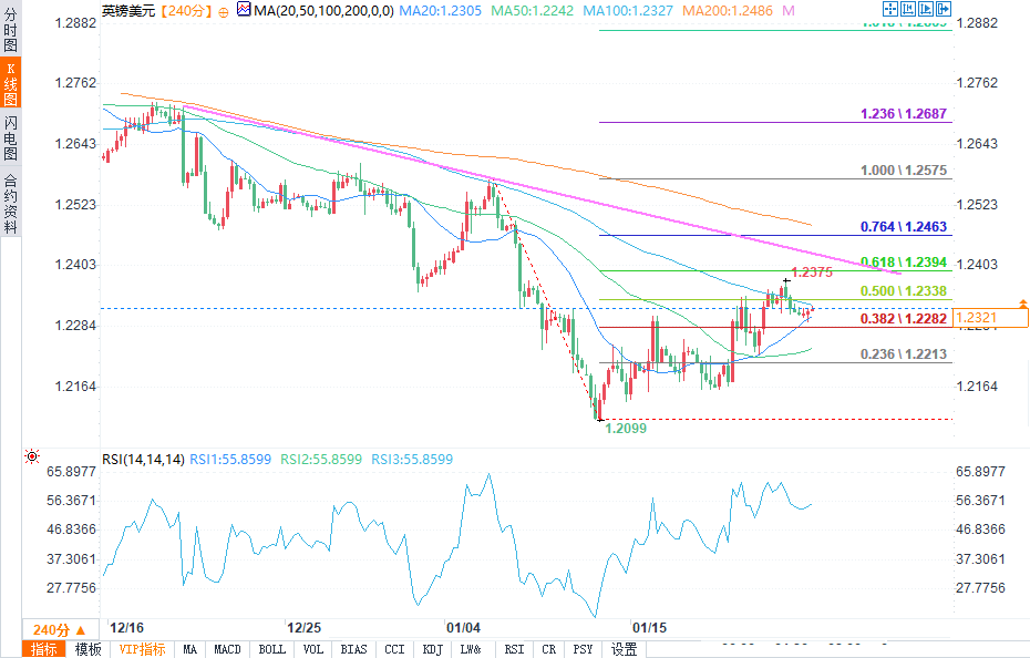 汇通财经APP讯——周四(1月23日)欧盘时段,英镑/美元盘中持稳,报1.2320/21,涨幅0.09%。英镑/美元从1.2100区间开启回升浪潮,4小时图上,一条主要的看跌趋势线正在形成,阻力位在1.2400。