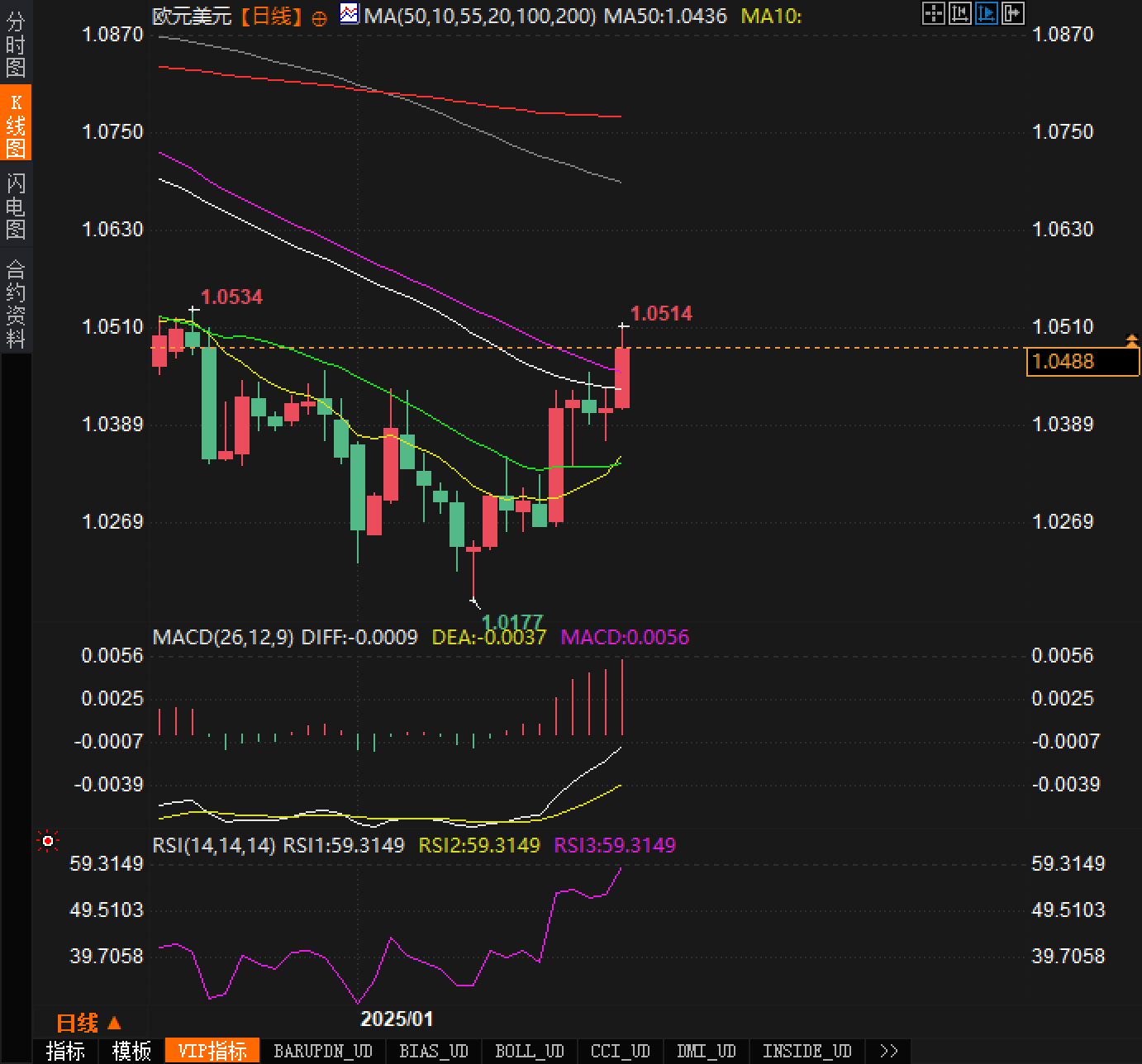 欧元/美元近期出现了一定的上行势头,目前汇价接近1.049附近。价格突破了关键的阻力位1.0421,并站稳了该水平之上,表明短期内多头动能正在增强。20日和50日均线都呈现出上涨趋势,进一步验证了多头趋势的强劲。