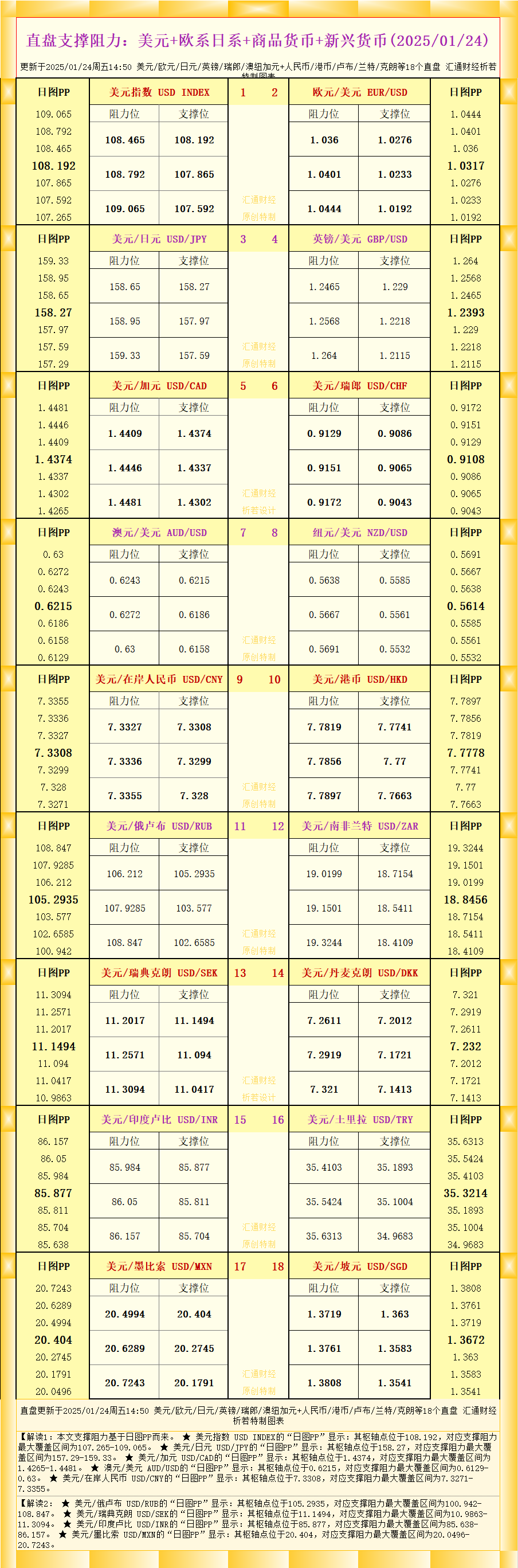 标题:一张图看18个直盘外汇支撑阻力:美元+欧系日系+商品货币+新兴货币(2025/01/24)