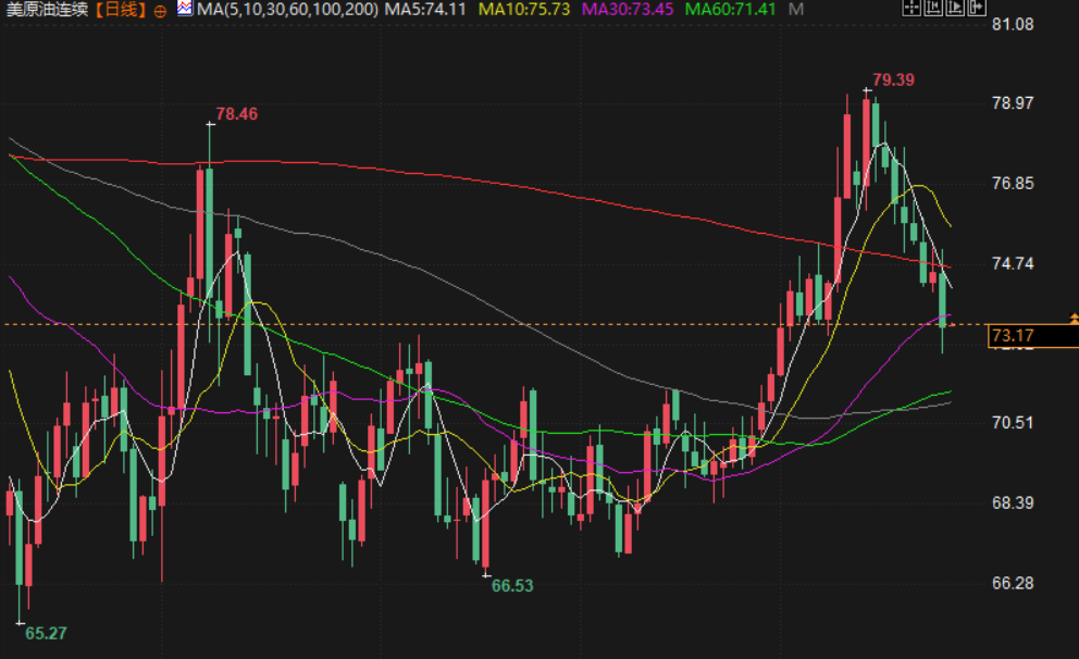 布伦特原油期货收跌1.42美元,跌幅1.8%,结算价报每桶77.08美元;美国原油期货收跌1.49美元,跌幅2.0%,结算价报73.17美元。