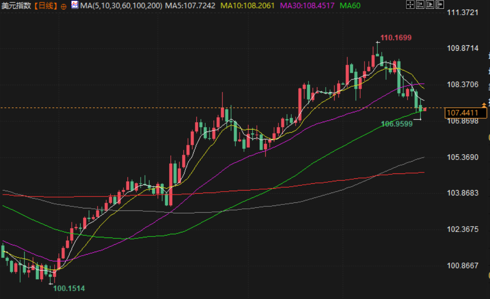 美元指数下跌0.29%,至 107.36,此前曾跌至 12 月中旬以来的最低水平。欧元涨 0.02%,报 1.0491 美元。