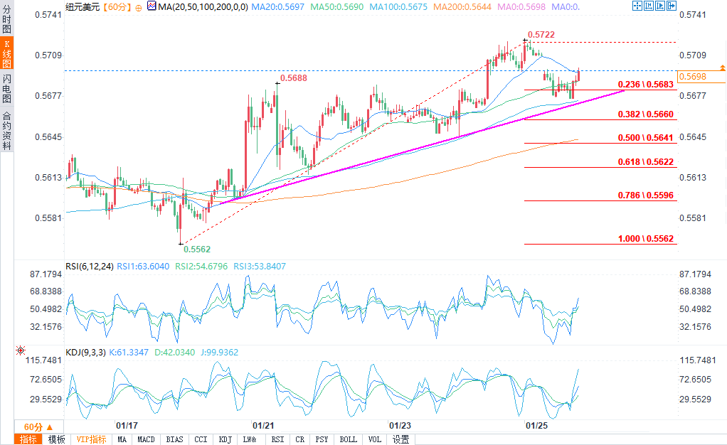 在下行路上,即时支撑位位于从0.5563低点到0.5723高点0.5685向上波动的23.6%斐波那契回撤位附近。