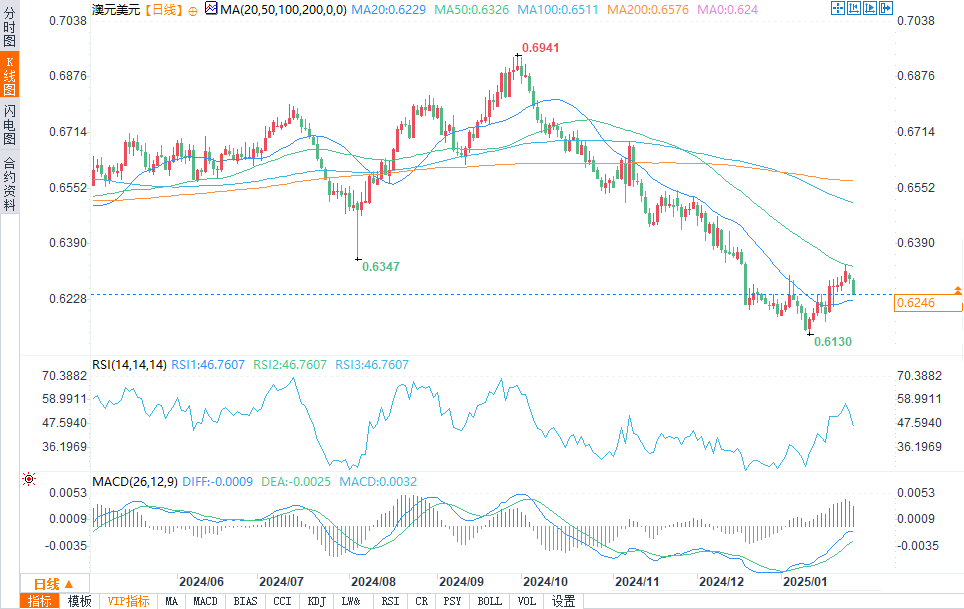 周一科技股的抛售打压了市场对风险资产的偏好,因此澳元/美元在亚洲交易时段过半时连续第二天下跌。但与科技股,尤其是半导体板块的大幅下跌相比,澳元/美元的表现相对较好。此外,还存在经修整后的平均消费者物价指数不够疲软,不足以支撑当前2月降息定价的风险,这可能会推动澳元/美元走高。