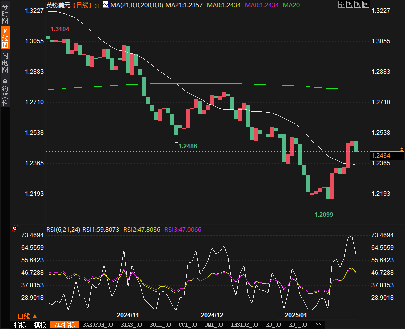 英镑兑美元同样表现疲软,日内下跌0.51%,交投于1.2433附近。英国经济面临滞胀风险,劳动力市场需求疲软和通胀压力居高不下,令投资者对英国央行未来的货币政策产生疑虑。市场预计英国央行可能在2月6日的会议上降息25个基点,将利率下调至4.5%。