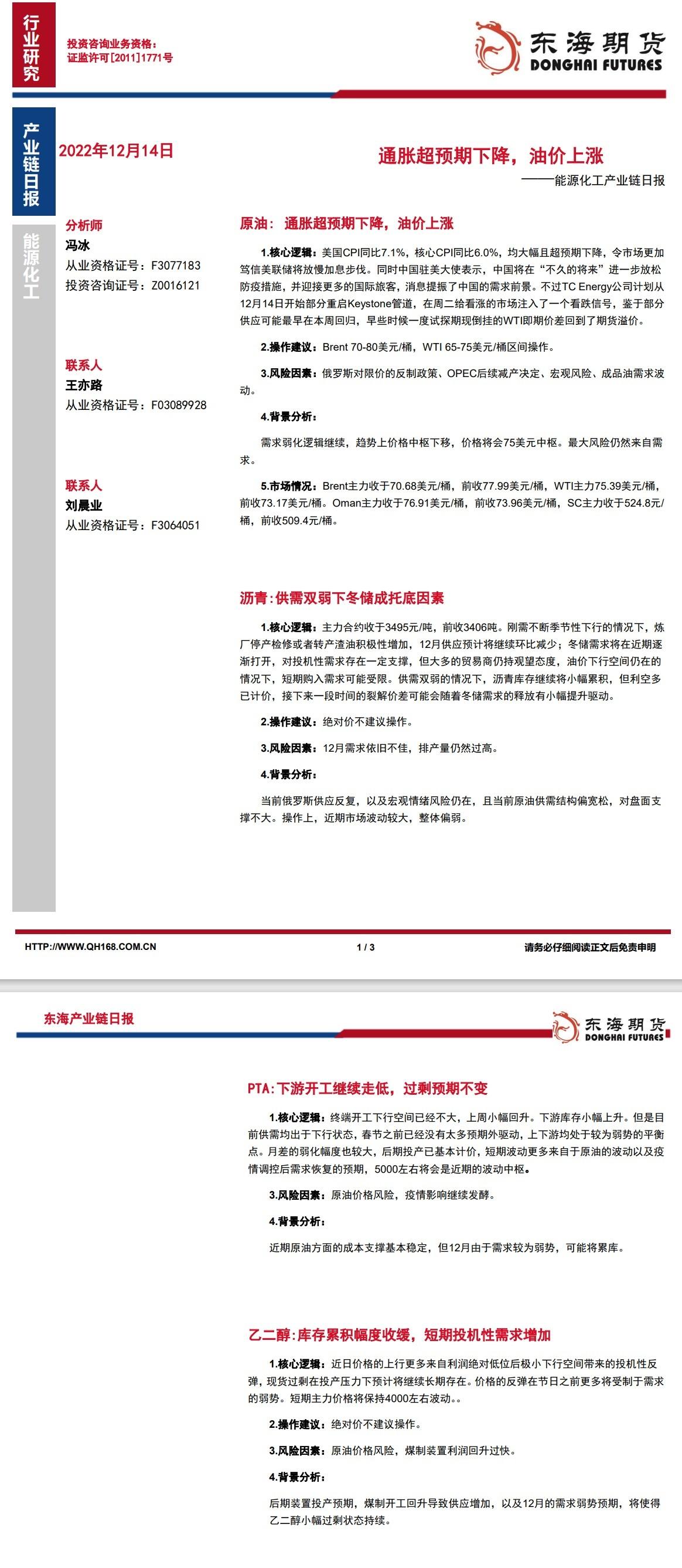 标题:【东海期货12月14日产业链日报】能化篇:通胀超预期下降,油价上涨