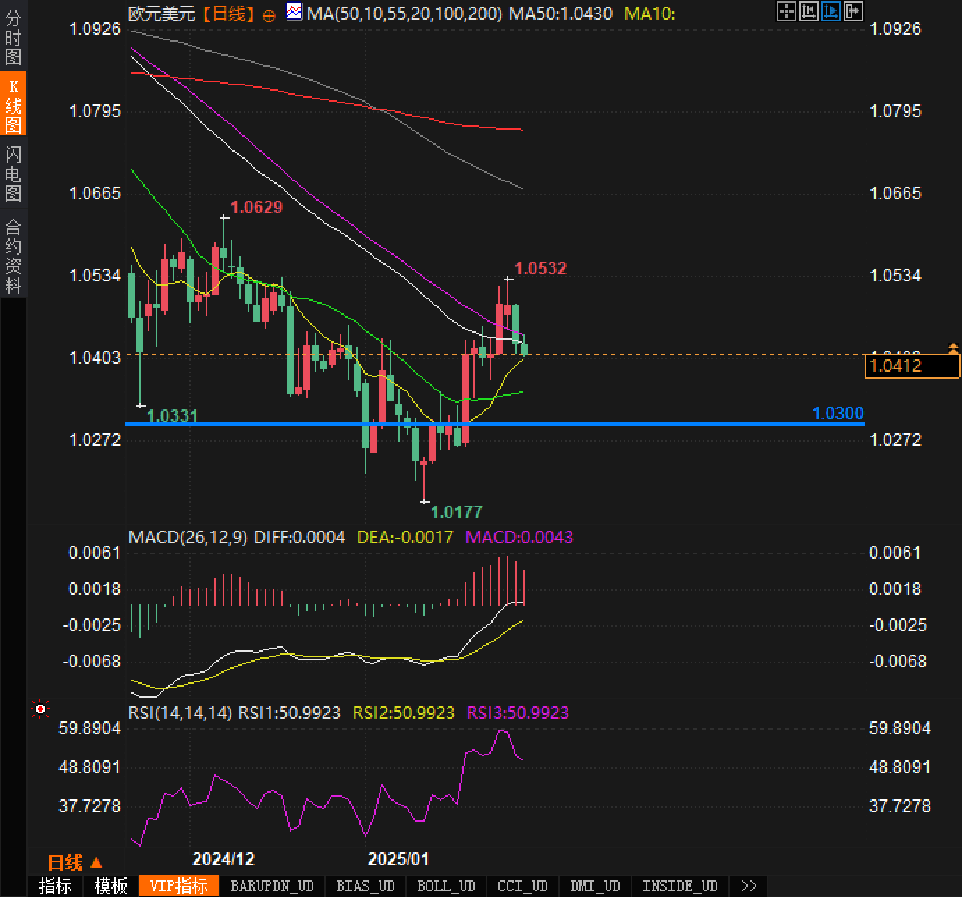 当前市场关注美联储政策会议,尽管短期内未必有大变动,但3月的降息预期引发了市场关注。特朗普的关税政策仍是最大不确定因素,可能影响美联储决策及市场情绪。欧元/美元面临2%关税风险溢价,考虑到政策分歧和关税风险,分析师认为欧元/美元下行至1.03的风险较大。