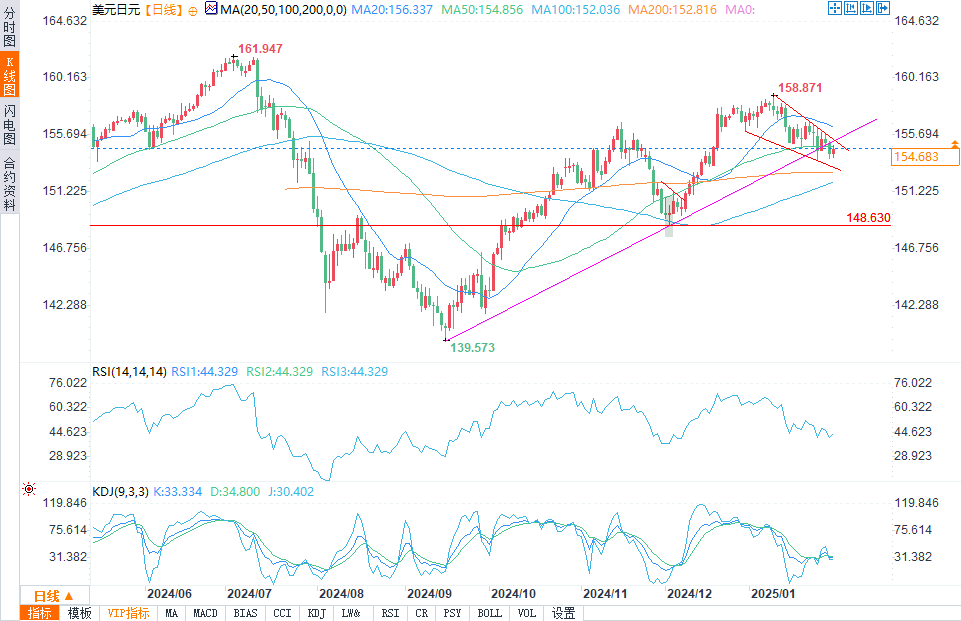美元/日元在技术面仍显疲态。尽管有消息称美国政府将从周六开始对墨西哥和加拿大进口商品征收25%的关税,导致美元再次未能突破楔形支撑位,但值得注意的是,迄今为止,美元的走强并没有对日元产生过大的影响。