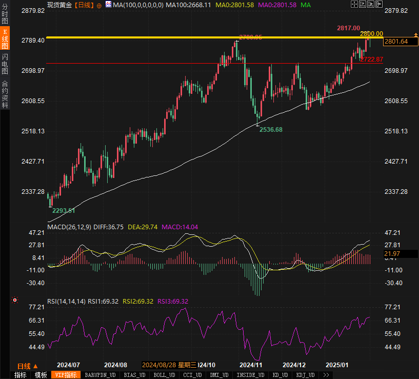 从长期趋势来看,黄金价格仍处于上行通道中。上周五创下的2817美元/盎司的历史高点表明,市场对黄金的看涨情绪依然强劲。若金价能够突破2800美元/盎司的心理关口,并站稳在这一水平上方,未来可能进一步上探2850美元/盎司的目标位。