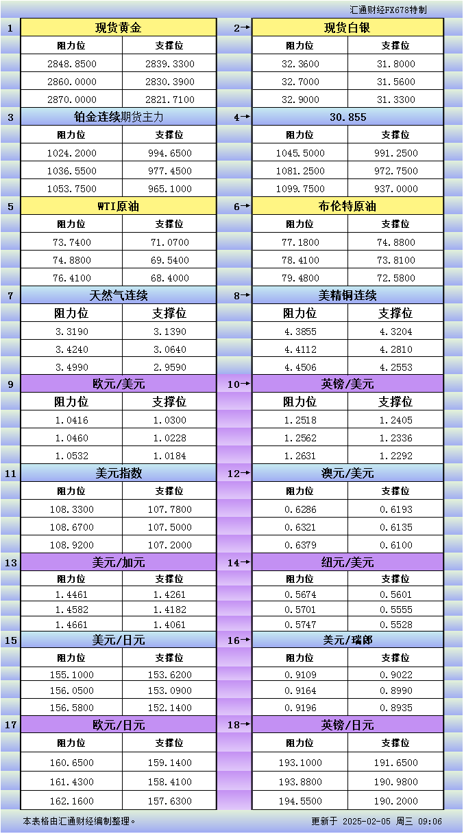 汇通财经APP讯——2月5日亚市更新的黄金、白银、铂金、钯金、原油、天然气、铜(商品)以及:美元指数、欧元、英镑、日元、瑞郎、澳元、加元、纽元(热门货币对)的支撑阻力位一览。