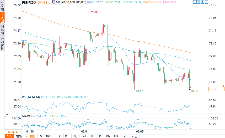 小时图来看,周一价格上涨突破 200小时移动平均线,但未能保持上涨势头。昨日大部分时间以及今日,100小时移动平均线一直是阻力位,行情看跌。价格低点已向昨日低点70.64美元下移,今日最低价达到70.66美元。