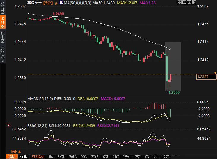 英镑兑美元(GBP/USD)立刻出现了剧烈波动,短线跳水近70点,最低触及1.2359。尽管最终稍有回升,但英镑日内的跌幅达到了0.90%,报1.2390。