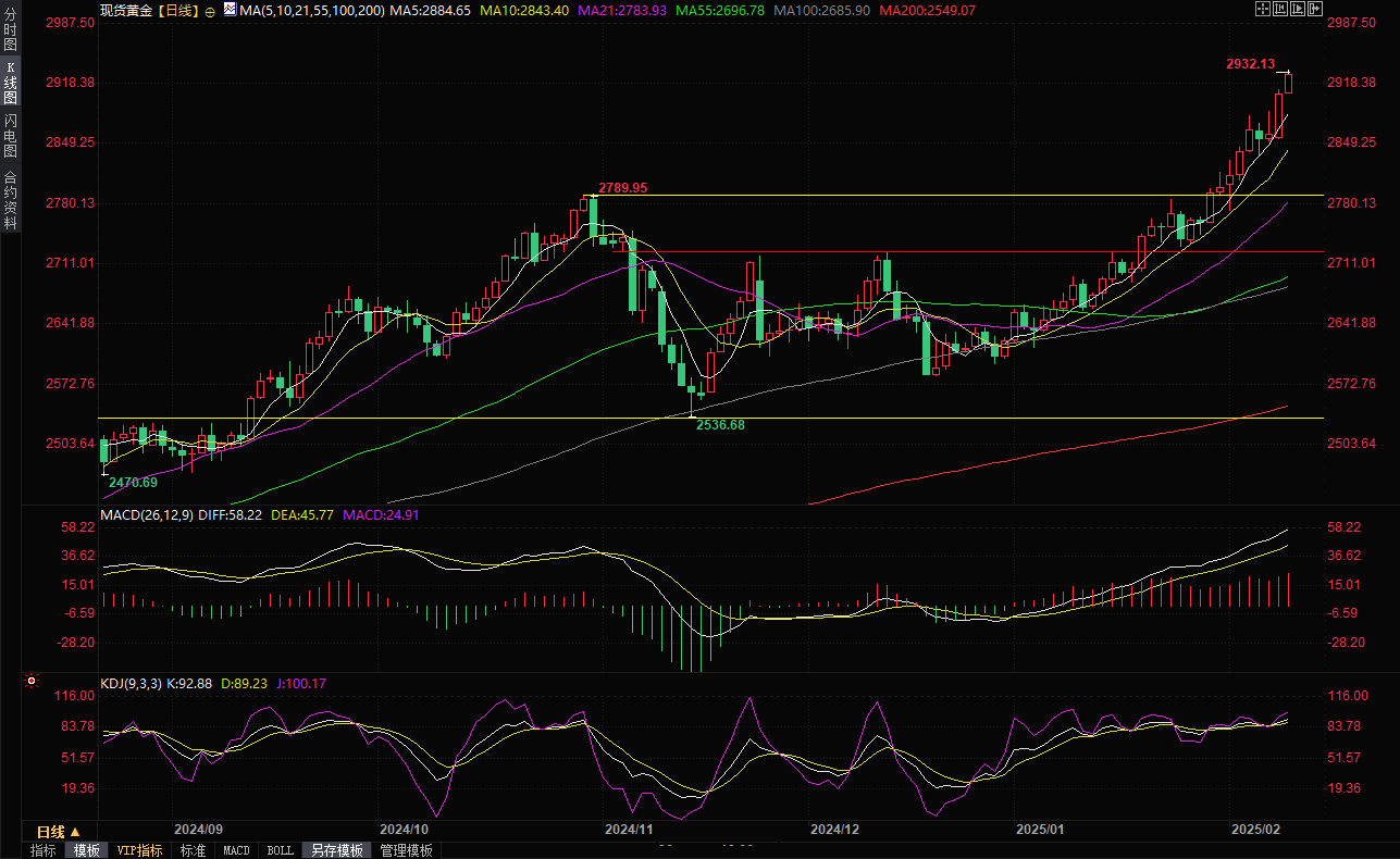 现货黄金周二(2月11日)亚市,继续冲高,截止09:40,最高触及2932.13美元/盎司,连续三个交易日刷新历史记录高点,涨幅约0.83%。