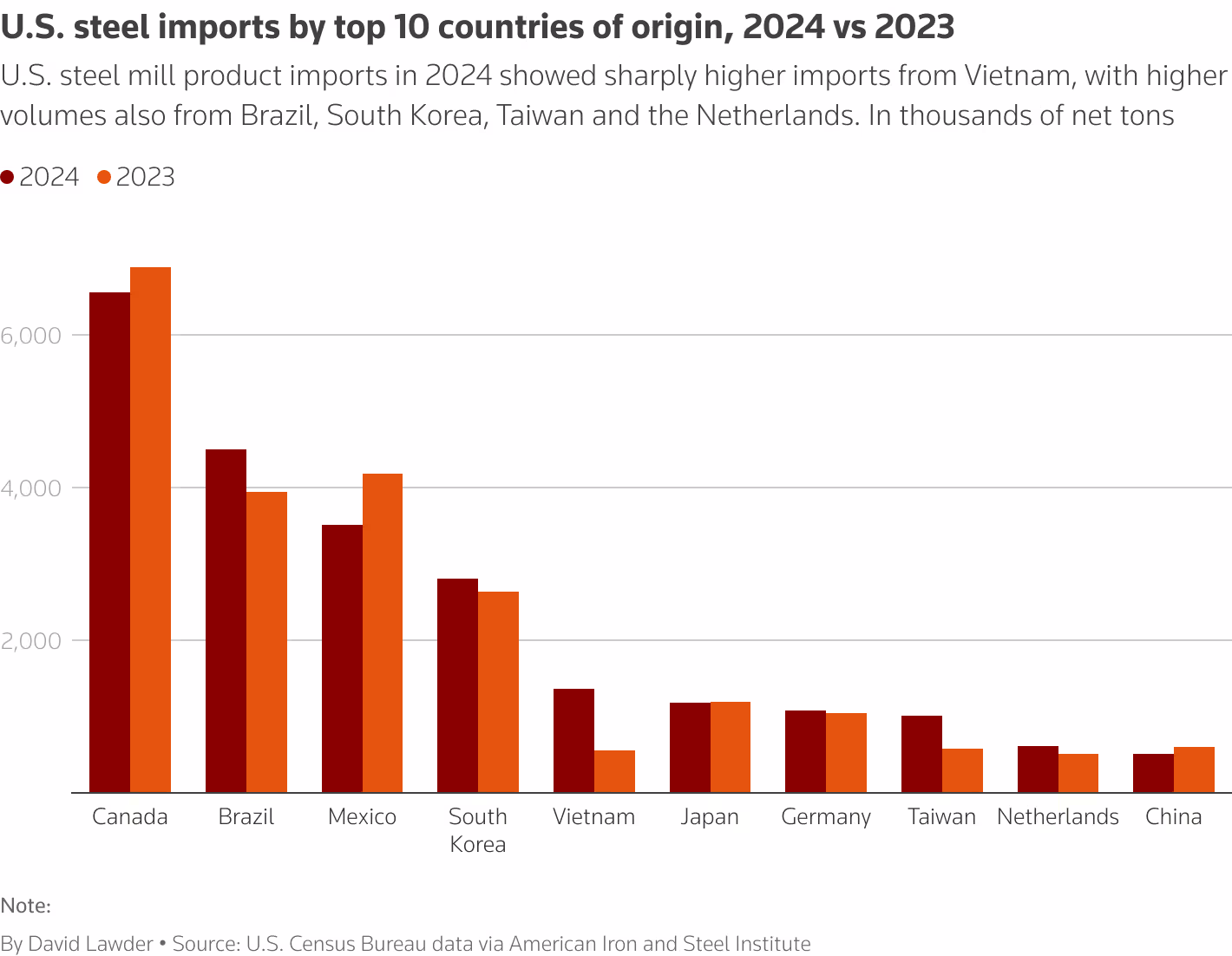 根据政府和行业数据,美国进口钢铁的最大来源国是加拿大、巴西和墨西哥,其次是韩国和越南。