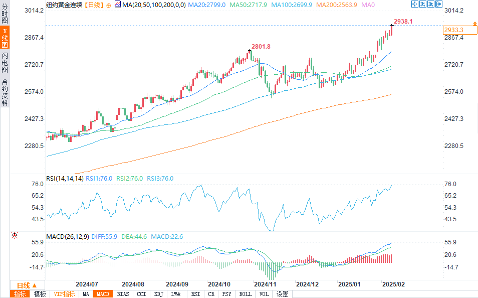 汇通财经APP讯——金价周一(2月10日)美盘时段大幅上涨并创下历史新高,目前距离每盎司3000美元仅一步之遥。由于美国对贸易伙伴国实施更多关税,加剧了全球经济增长担忧,黄金和白银市场继续受到避险需求的推动。美国政府其他政策的快速变化也令市场感到不安。此外,看涨的技术面也驱动了黄金的买盘。4月黄金期货价格上涨39.70美元,收于2927.40美元。3月银期货价格上涨0.027美元,收于32.47美元。
