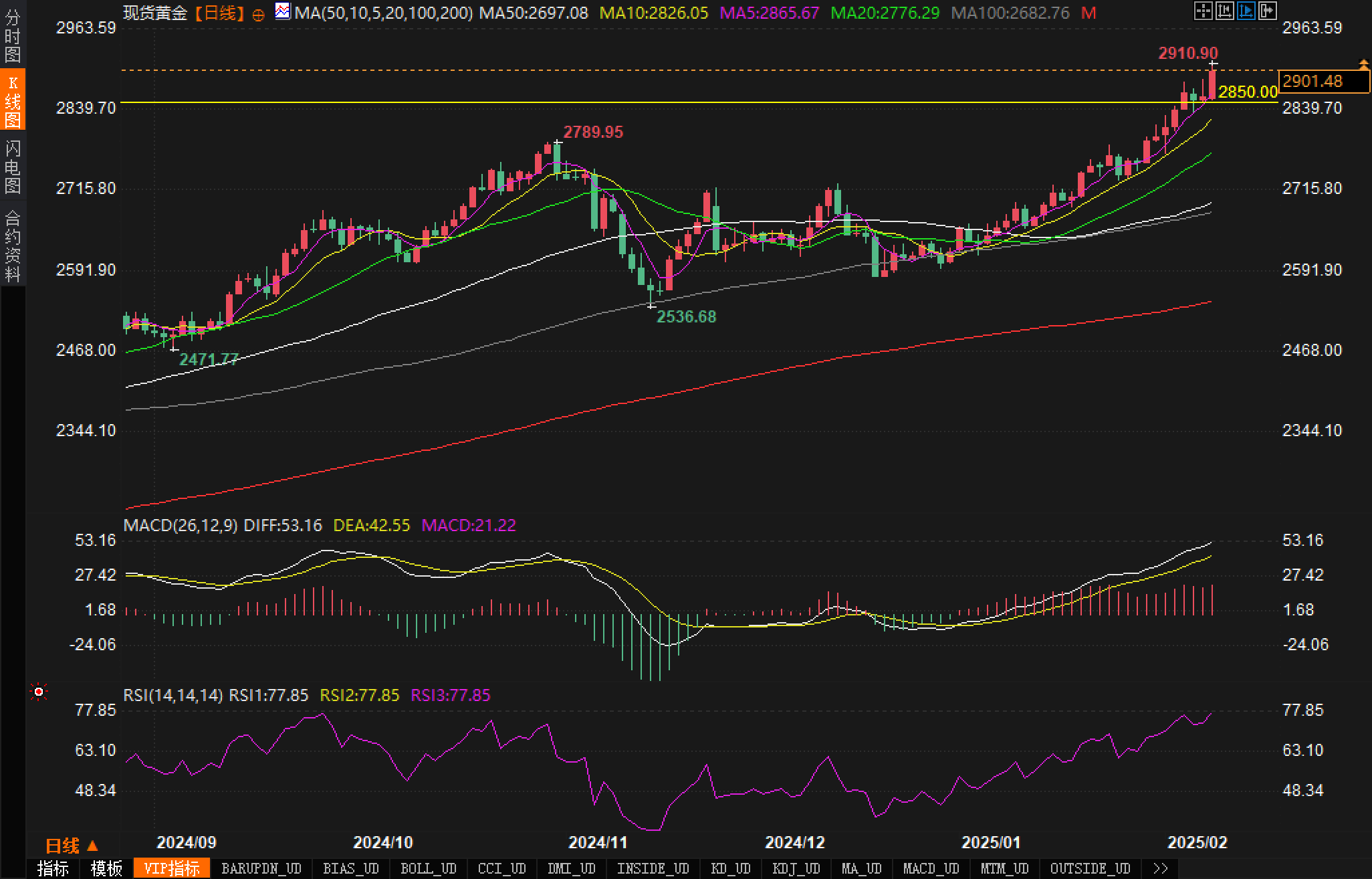 从技术图形角度观察,当前(2月10日)黄金价格正处于每盎司2900美元的关键区域,市场多头情绪依然浓厚。技术分析师普遍认为,若金价能够在2900美元以上稳固站稳,后市将有望进一步上攻至3000美元的心理关口。现阶段,技术指标显示,MACD指标和相对强弱指数(RSI)均已超过超买水平,表明市场上行动能强劲,但同时也提示短期内可能出现一定的震荡调整。支撑方面,若金价出现回调,关键支撑位可能落在2850美元左右。