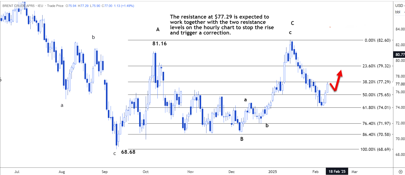 布伦特原油可能回撤至 76.08 美元,因为未能突破每桶 77.32 美元的阻力位。