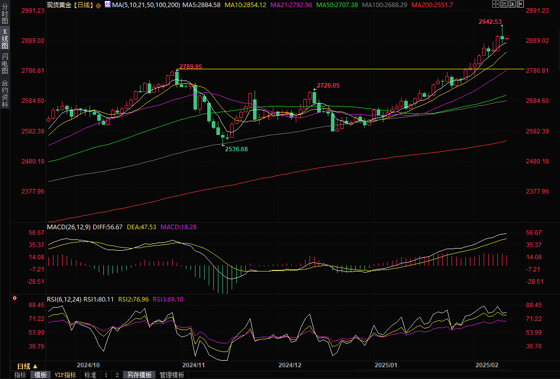 现货黄金周二收盘下跌0.36%,至每盎司2897.38美元,盘中早些时候曾触及2942.70美元的高点,为年内第八次刷新历史记录高点。