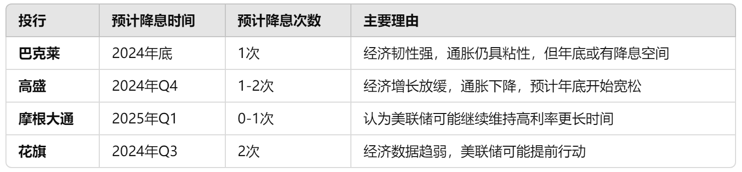 对于美联储降息的时机,各大投行的观点出现了分歧。以下是几家主要投行的最新预测: