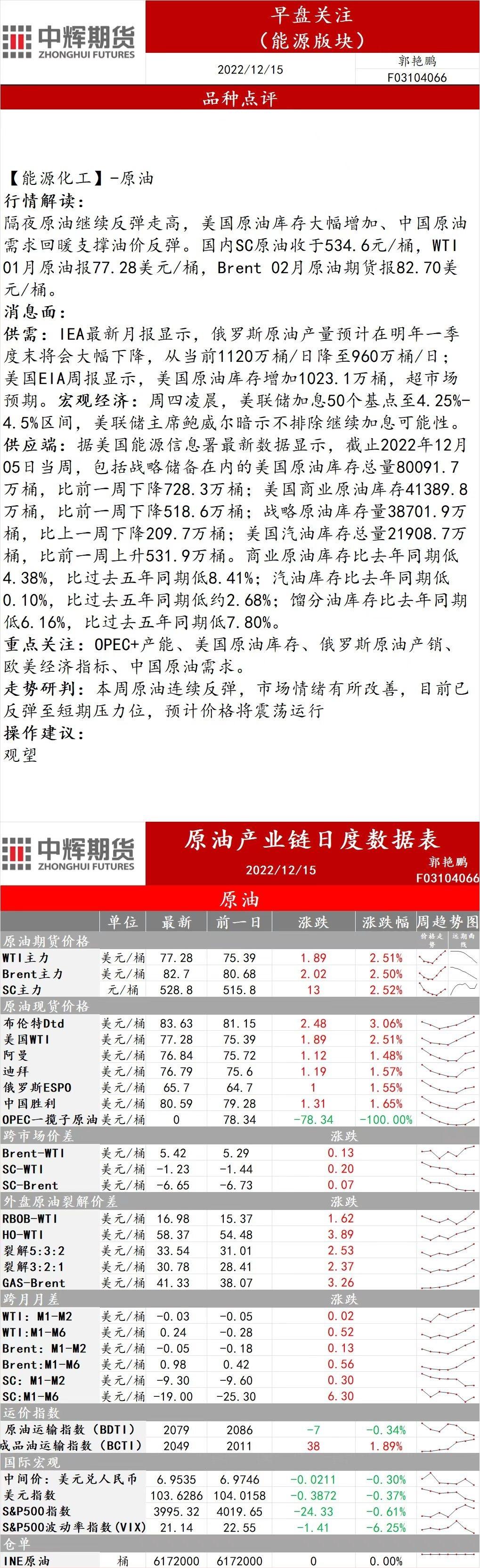 12月15日,中辉期货发布能源早盘关注,称市场情绪有所改善,目前已反弹至短期压力位,预计价格将震荡运行,建议观望。